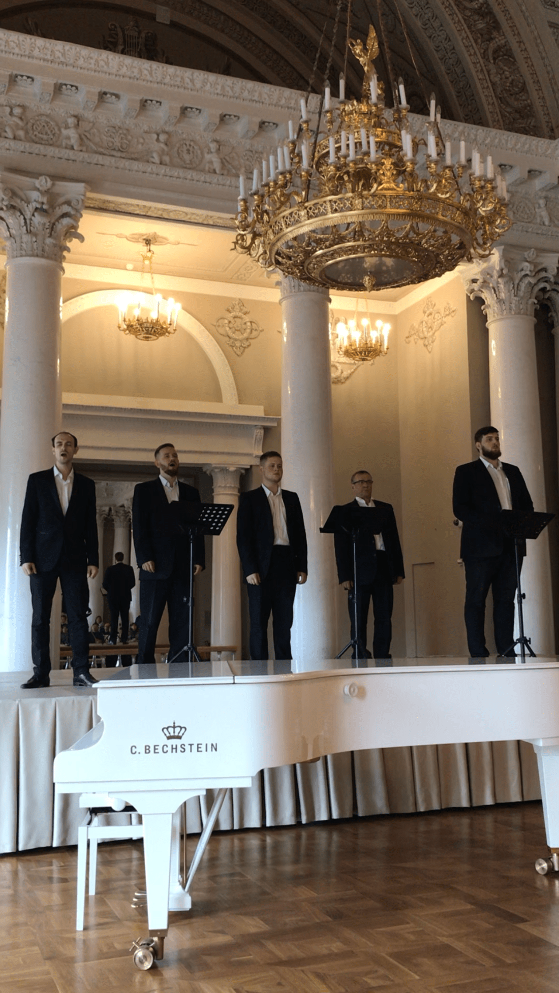 O final da nossa visita ao Palácio Moika, “coincidiu” com a apresentação de um coral no salão de baile. A guia Nádia planejou tudo com precisão.  São quatro cantores (tenores) que sem qualquer instrumento musical para acompanhar fazem um espetáculo de incrível qualidade. As músicas são lindas e fiquei emocionada. É gratuito, os músicos vendem seus CDs no final.