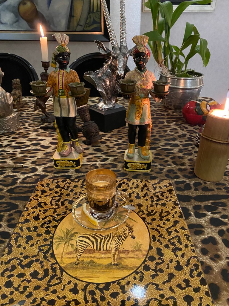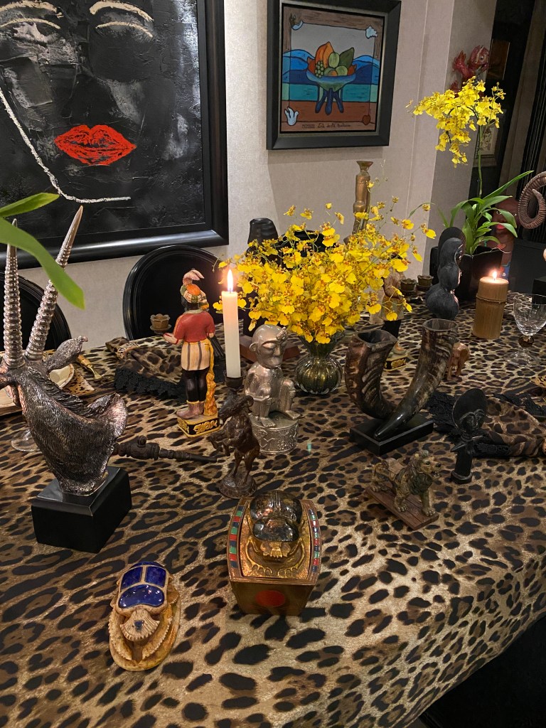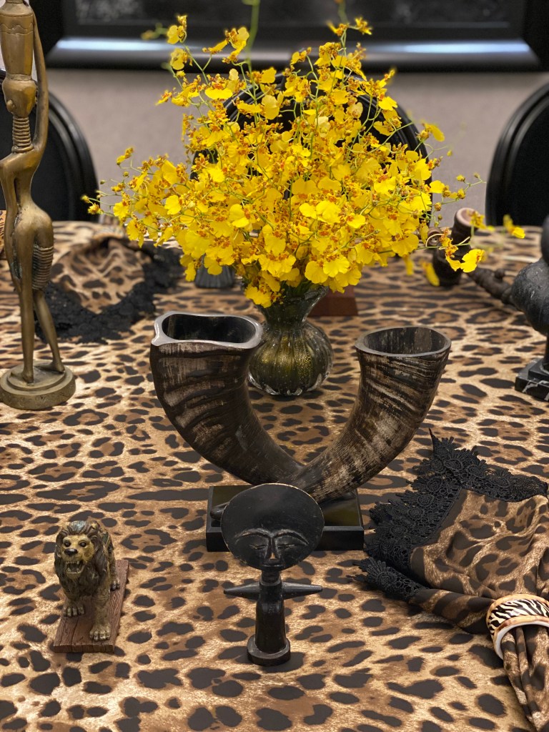 N decoração da mesa procurei usar todos os objetos que eu tinha que se relacionassem com o tema. Fiquei impressionada como possuo peças sem nunca ter visitado estes países africanos. Esculturas de ébano da feira africana do Harlem NYC, porta jóias de máscara vermelha africana, cabeça de carneiro, porta vela de bode em bronze, cabeça de Órix (antílope) pratada, cachimbo de ébano, pente de madeira africano e objeto de chifres entrelaçados comprado em Paris.