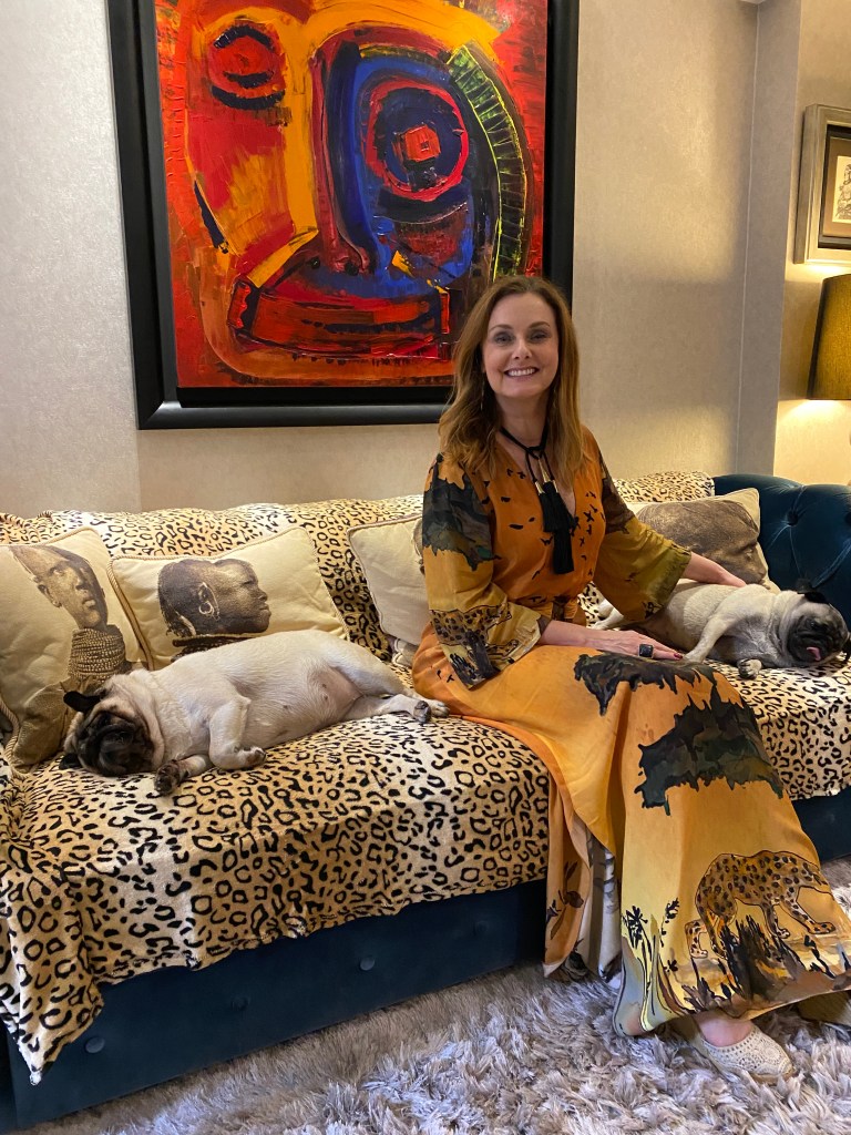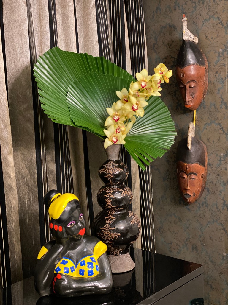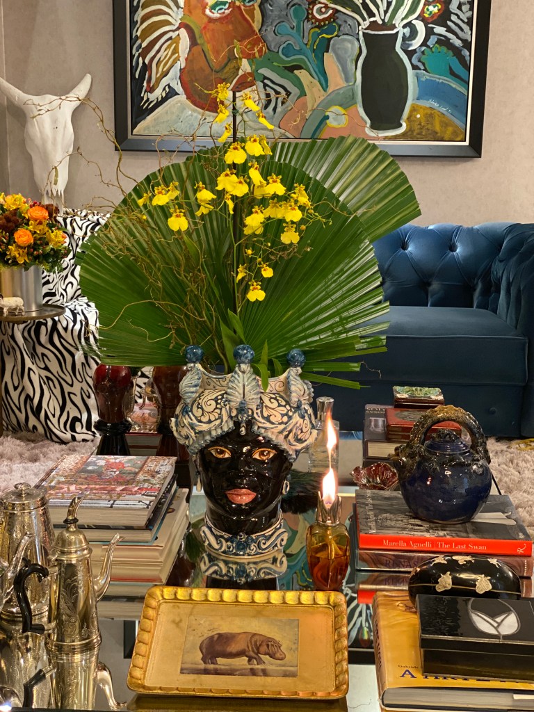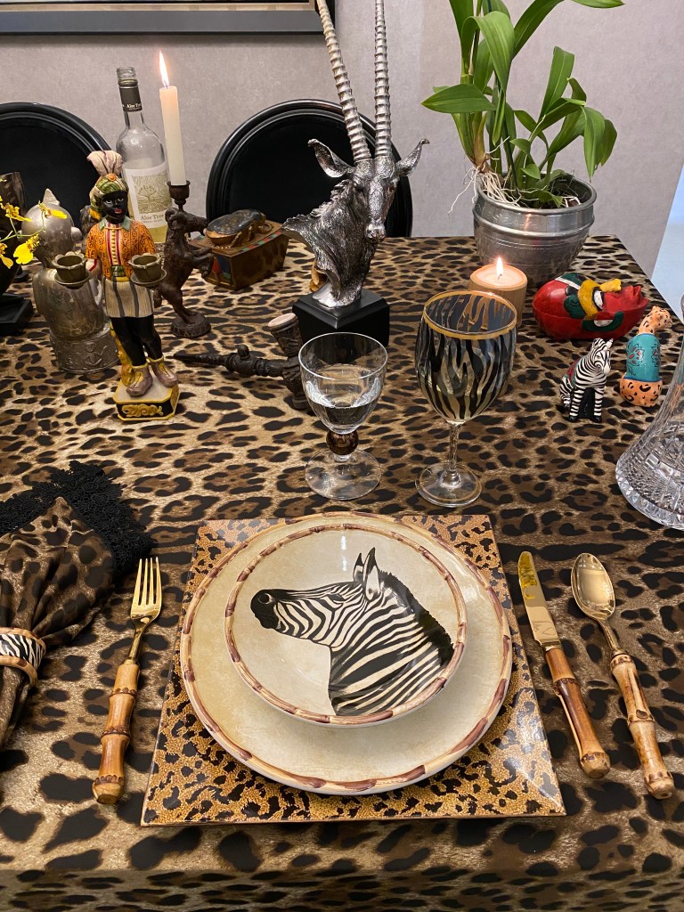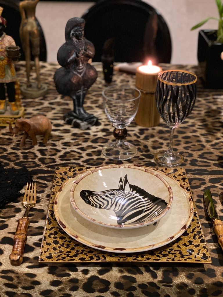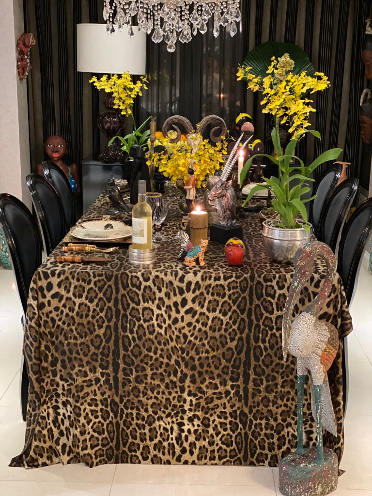 Neste jantar resolvi também decorar a sala de estar. Usei uma manta de leopardo para cobrir um sofá, almofadas com rostos de africanas que estava na casa da minha mãe (o tecido é Donatelli). Cabeça de moura e vaso com arranjos florais da Oficina da Terra Loja, no Beiramar Shopping, com folhas verdes grande e orquídeas cymbidium amarela. Máscaras africanas da feira do Harlem NYC. Manta de zebra em outro sofá, cabeça de boi pintada de branco (arte do marido), mais alguns objetos espalhados pela casa que tinham a ver com o tema: prato com desenho de hipopótamo, fruteira de bananas, bustos de negras em gesso e em papel machê.