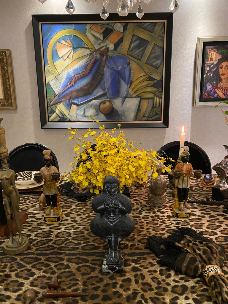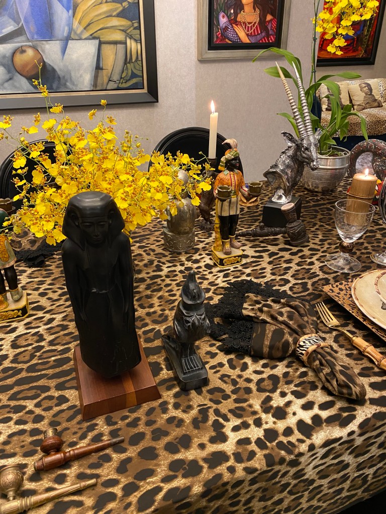 Em alguns jantares gosto de informar algo a mais sobre o local. Pode ser filme, música, livro, tudo o que me inspirou para aquele tema. Um dos objetos que usei na decoração da mesa é uma escultura de uma mulher negra que adquirimos em São Francisco, na Califórnia.