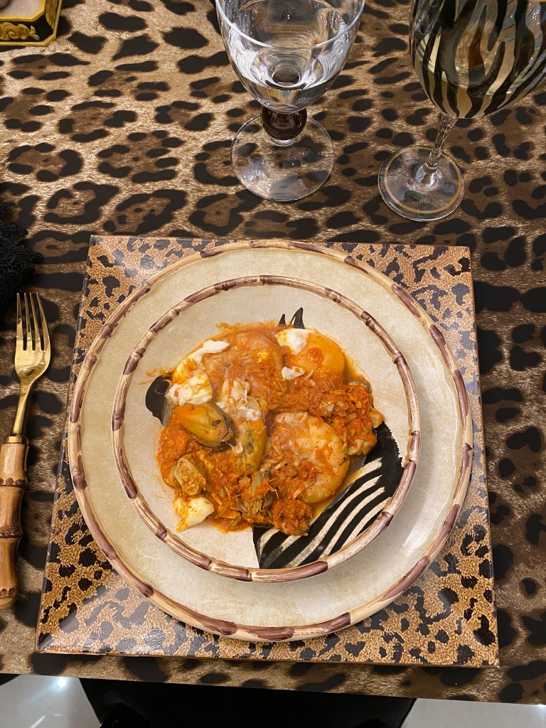No menu, para a entrada, o marido preparou uma sopa de frutos do mar. A receita é de bouillabassie, um caldo com peixe, marisco, ostra e camarão que no jantar virou “African Fish Soup”. Ficou bem grosso o caldo, quase não aparece e o Chef marido também colocou ovos, ficou um espetáculo!