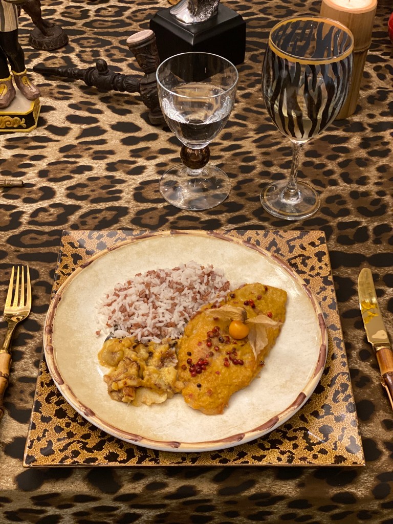 O Prato Principal pedi no restaurante dos meus queridos amigos Rico e Jó, o Bistrô da Praça, que é a nossa segunda casa, frequentamos há 15 anos. No cardápio se chama Congro à Martinica. Um peixe com molho de manga que vem acompanhado de arroz selvagem e banana. Apesar da Martinica ser uma ilha de possessão francesa no Caribe a maioria da sua população é africana e portanto sua culinária tem forte influência desse continente, assim, achei que o prato combinava com o tema do jantar e estava uma delícia!