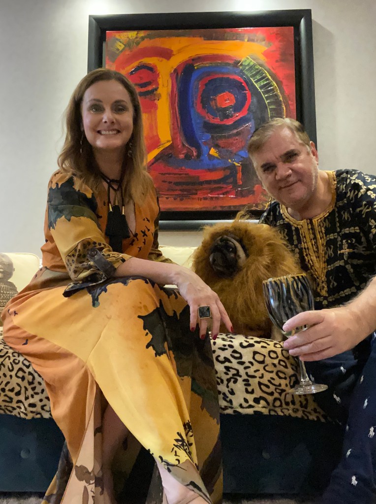 Por isso resolvi montar um jantar especial para o Dia dos Namorados e sonhar com este roteiro, com o tema: Uma noite na Savana. Para a “chamada” dos convidados virtuais contei com a participação especial da filha mais nova, Peggy que arrasou como Simba, o Rei Leão, mais a trilha sonora do filme de animação.