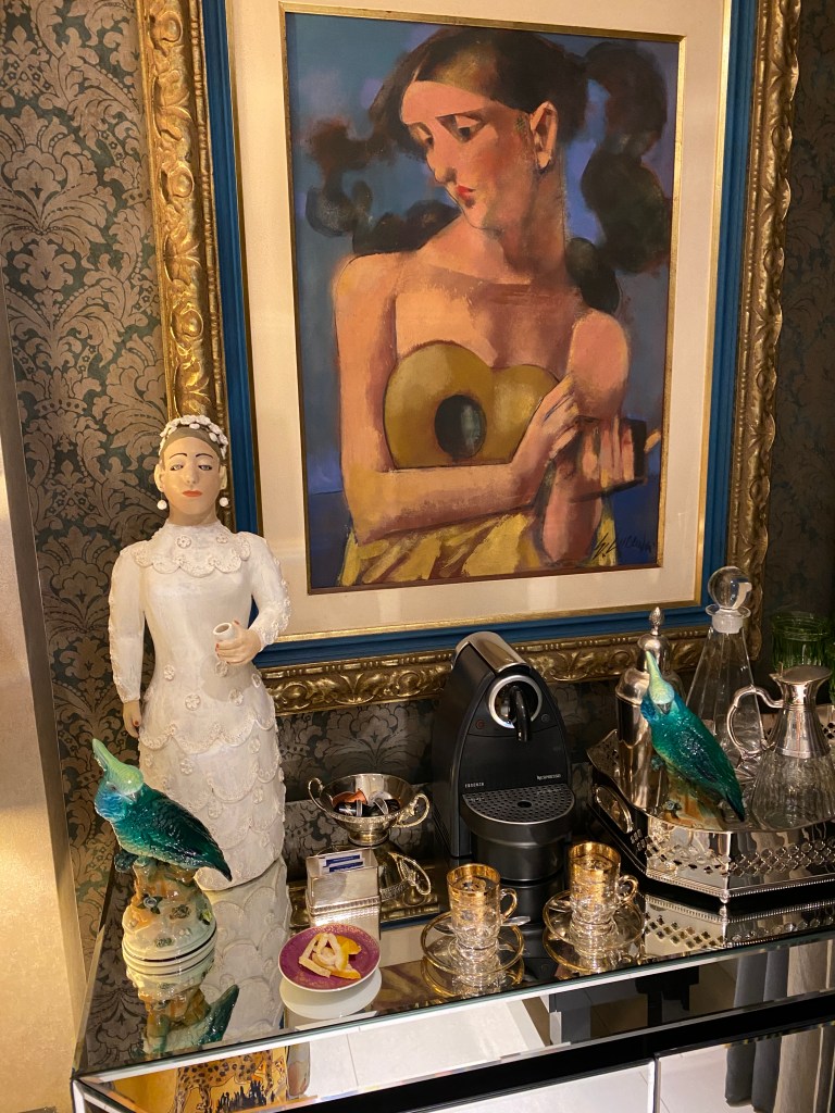 A peça de alpaca a esquerda da foto da loja Artshop Center (que não existe mais) representando as “mulheres girafas” da tribo Ndebele da África do Sul que usam argolas para esticar o pescoço. Mais dois blackamoor, peças produzidas na Itália, principalmente em Veneza que representam negros/ mouros/muçulmanos.