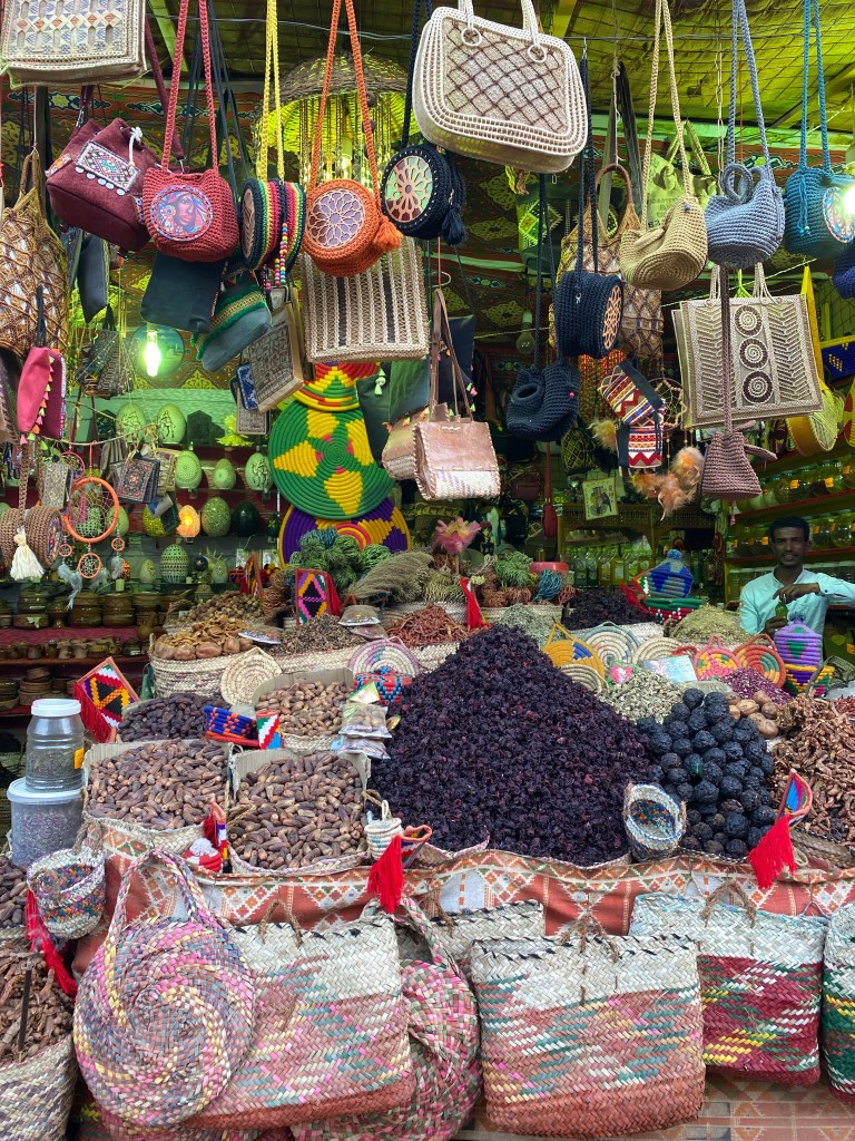 Os pigmentos à venda formam um colorido lindo com os tecidos e todos os outros itens das barracas. Um festa para os olhos!